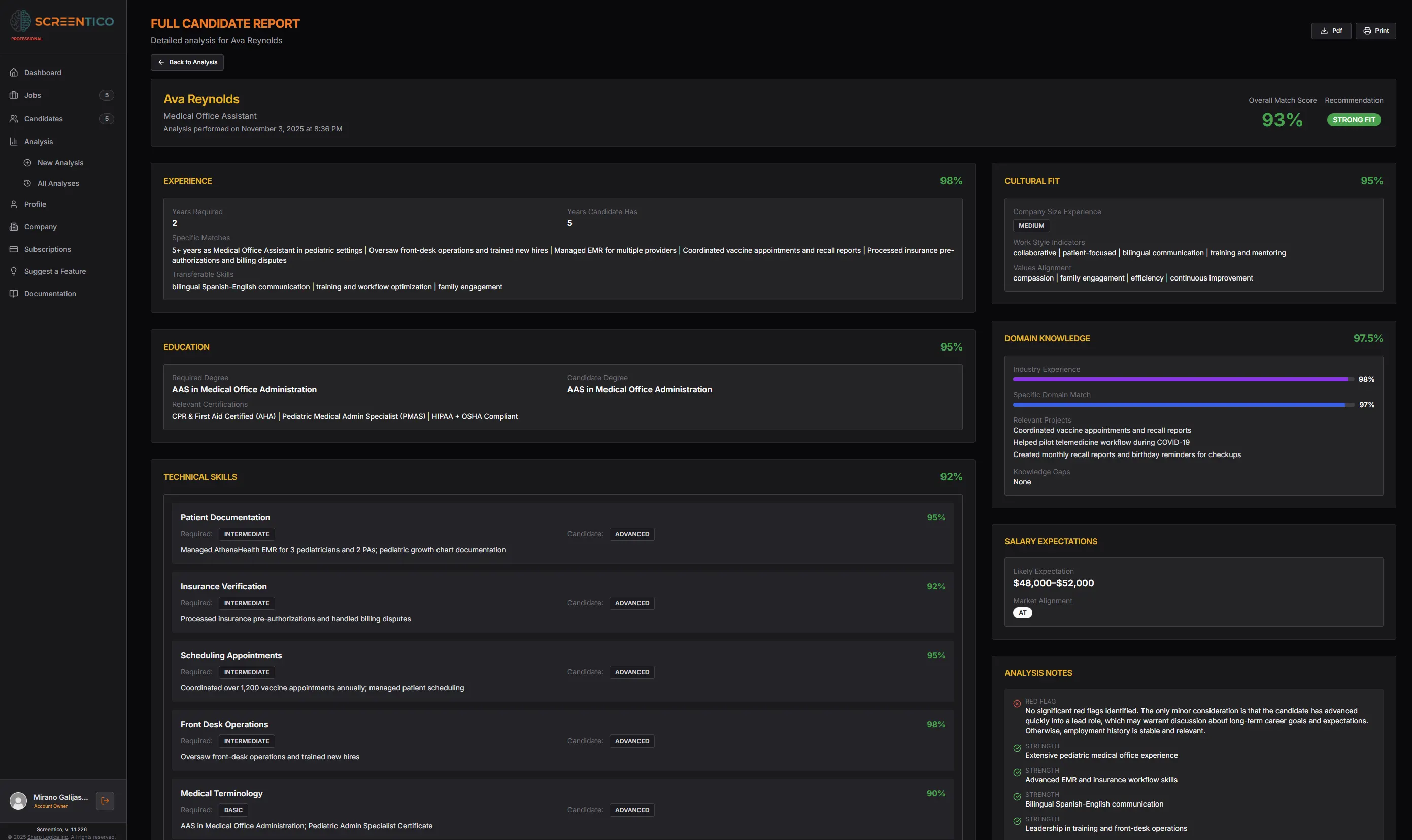 You still decide which candidates move forward, how to interpret edge cases, and how to present recommendations to your client. Screentico just gives you consistent, explainable evidence in minutes instead of hours.